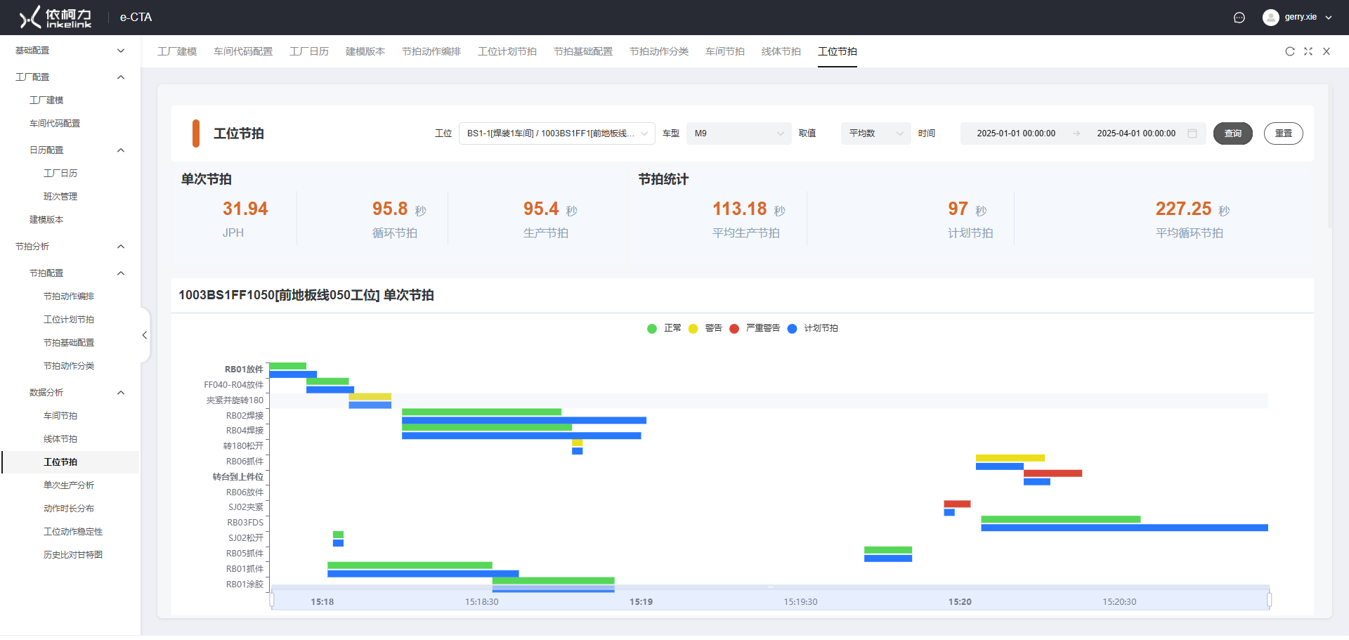 某新能源汽车工厂导入节拍分析e-CTA功能后,对焊装与总装自动化工位以工序级颗粒度进行节拍编排、数据采集与分析。支持车间节拍、线体节拍、工位节拍、单次生产节拍、动作时长分布、工位动作稳定性、历史对比等多维度分析,快速识别工序瓶颈,保障生产有序进行。